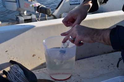 Next, we used a YSI Water Quality Monitor which measures the temperature, pH, dissolved oxygen and conductivity of the water. This device allows you to probe the water and displays the various readings on screen.